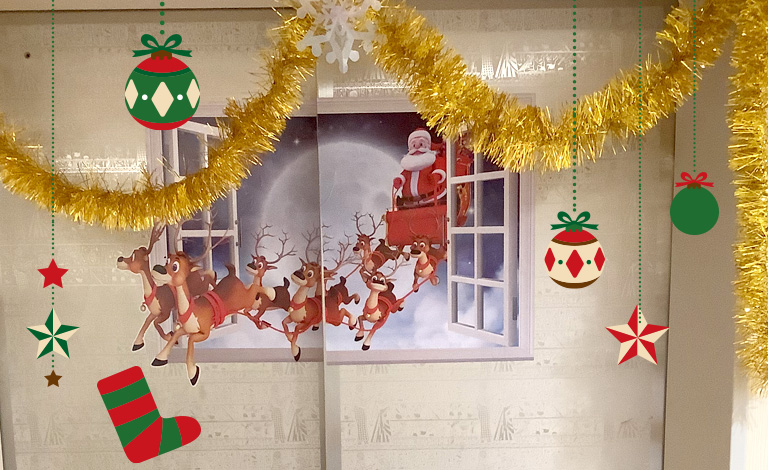 季節の便り「ケヤキ倶楽部越谷」より season 2021.12.15 季節の便りお知らせ 12月の便り ケヤキ倶楽部越谷 ケヤキ倶楽部越谷ではエレベーターや厨房の窓にも本格的なデコレーションが施されています。 大きなツリーが壁に出現! エレベータのドアは、サンタさんの世界に繋がってそう。 厨房では、サンタさんがプレゼントを持って待っています。