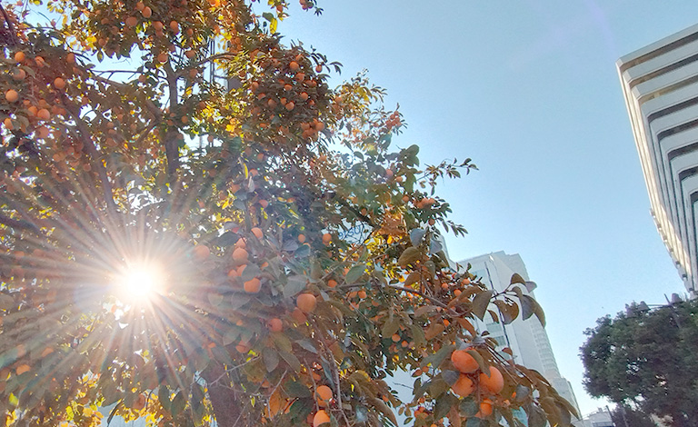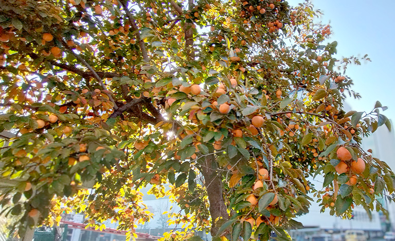 季節の便り「シーヒューマン本社」より season 2023.10.31 季節の便りお知らせ 11月の便り シーヒューマン本社 シーヒューマン本社の近くの交差点で、なんと柿の木を発見! 交通量の多い交差点で、朝日を浴びて輝く木が! 柿の実が、たわわに実っていました! 渋柿だろうなと思いつつも、なかなかの壮観でした。