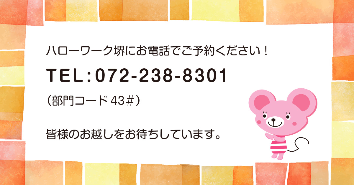 - お問い合わせ先→ハローワーク堺 TEL:072-238-8301(部門コード43#)